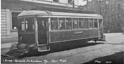On April 20, 1891, the newly incorporated Davenport Street Railway Company was awarded rights to operate a streetcar by West Toronto Junction.[7] When the route began operation on September 6, 1892, it was the second electrified streetcar line in the Toronto area—earlier routes being horse-drawn. The route ran from Keele and Dundas streets to Bathurst and Dupont streets. In 1894, the Davenport Street Railway Company was purchased by the Toronto Suburban Street Railway Company, which was in turn acquired by the owners of the Canadian Northern Railway.[8] The line had originally used a broad gauge, like Toronto's other streetcar lines—so railway companies couldn't run freight on ordinary streets. Although it was later changed to standard gauge no freight was ever carried.