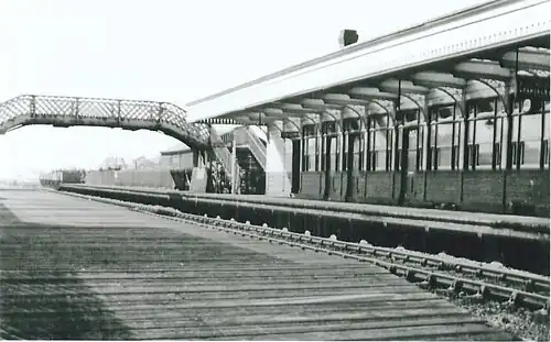 The station was located to the east of the town centre, and was made mostly from wood. It was on a passing loop and had two platforms linked by a footbridge. The main station building was located on the down (westbound) platform, with a small waiting room on the up platform. Adjacent to the station were some goods sidings.[1] The station was closed to passengers on 15 September 1958, however the line remained open for freight until 2 December 1963.