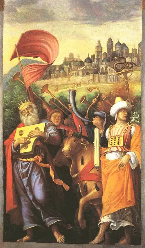 The work is thought to be one mentioned in abbot Luigi Lanzi's treatise on Andrea Mantegna's circle, “I giovani Mantegni”, in which he records a painter called "Carlo del Mantegna", working on Andrea Mantegna's funerary chapel and on "two history paintings of the Ark in the monastery of San Benedetto in Mantua, where we see Andrea's style again, albeit with less beautiful forms". Since Correggio is now known to have worked on the doors of the organ cover at San Benedetto Po in Mantua, it is theorised that the otherwise-unknown "Carlo del Mantegna" was actually a reference to a young Correggio.[2]