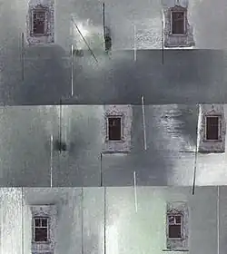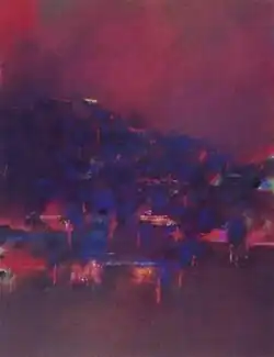 In 1981, Blackburn took up a position as a visiting professor at Georgetown University in Washington D.C.[10] At this time he became influenced by the vertical perspectives of the American cityscape, and began to experiment with electronic imagery and collage techniques. However, after this short period of experimentation Blackburn realised that his 'inner life was based in the natural world, not the city',[11] and subsequently embarked on a complex and long-running sequence of transcendent pastel drawings known as the Landscape Vision series. In the early 90s, Blackburn returned to Huddersfield to care for his mother, who died in 1993. He remained in the north of England, where he continued to observe the landscape and work on his project of visionary panels, until his death in 2016.
