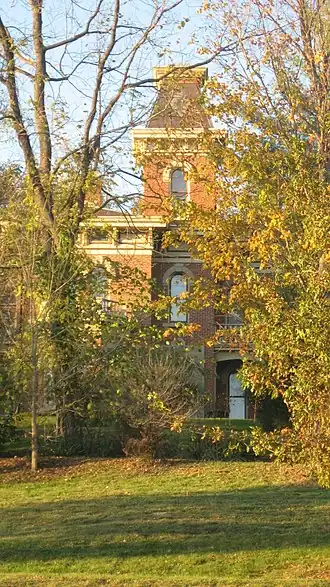 David Enoch Beem House, also known as the "Beem Mansion," is a historic home located in Spencer, Owen County, Indiana. Built in 1874, the large, two-story, Italianate-style residence is named after its original owner, David Enoch Beem, a local lawyer and banker, and his family. The T-plan, brick dwelling rests on a rusticated Indiana limestone foundation and arched openings framed in limestone. It features a three-story, central tower at the entrance with a steeply pitched mansard roof.[2][3] The home was listed on the National Register of Historic Places in 1989.[1]