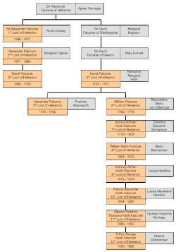 1. ^ Paul McKee Gifford. Falconer of Halkerton: A Genealogy of a Scottish Family and its branches in England, the United States, and Jamaica, including those spelled "Falconar" and "Faulkner". Heritage Books, Inc., Maryland USA. ISBN 9780788406157