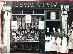 The David Greig chain is considered to have been established in 1870, when the wife of a Hornsey cabinet maker of Scots birth, Mary Greig opened a small provisions shop at 32 High Street, Hornsey.[2][3][4] By 1881 her son David Greig had joined her in the business and described himself as a 'provision dealer' in the census of that year.[2] The business thrived and wishing to expand beyond Hornsey, Greig opened his first shop at 54-58 Atlantic Road, Brixton in 1888,[2] which he and his wife, Hannah Susan Deacock lived above.[5] Around 1890 a second shop was opened at nearby Loughborough Junction, near Brixton. This was probably the shop at 232 Coldharbour Lane where a wooden 'David Greig' fascia with 'Brilliant cut' gilded lettering in the distinctive serif typeface of the chain, was uncovered in 2020.[6] In 1895, David Greig was accused of selling margarine as butter.[7]