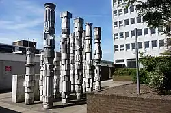 Having spent a year as a self-employed artist, Harding answered an advert in The Scotsman for a post with Glenrothes Development Corporation. From 1968 to 1978 he was town artist, working with the planning department to create site-specific work using the same concrete and brick as the newly developed housing.[4][5] His works in Glenrothe include Henge, a spiral of cast concrete slabs; Industry, a mural on an underpass based on patterns on African huts; Heritage, rows of concrete embossed columns; Dark Cemetery in Pitteuchar; and ten poetry slabs at bus stops, phone boxes, and the Glenwood shopping centre. Henge and Industry are now listed.[4] As his assistant, Stanley Bonnar created a concrete hippo; Harding and Bonnar placed them in groups at multiple sites in the town.[1]
