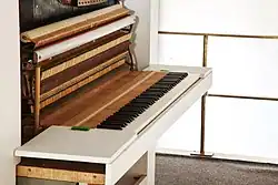While restoring and studying the architecture of grand pianos, Klavins became a critic of the traditional way to construct these instruments.[1] He stated that the materials used in common piano making are outdated and don't reflect the current status of materials science. With this in mind, Klavins designed a piano with a size, shape and interior construction based on modern knowledge of acoustics – rather than the historical construction guidelines used in traditional piano making. In November 1987, he presented the "Klavins Klavier Modell 370" to the public in the German city of Bonn. It had its name from its height: 370 centimetres. In contrast to horizontally built grand pianos, the Modell 370 is laid out vertically. It weighs two tons and stretches over two floors. The piano player sits on the bench in the top floor, while the main part of the strings and the resonance body continue below his feet. Due to this construction, the sounding board, responsible for the acoustic breadth of the instrument, is of double size of an ordinary concert grand piano. This leads to a rich sound and a larger spectrum of overtones. The lowest bass string is 3.03 meters long – about three times longer than in a standard piano.[2][3] As of 2012, the Modell 370 is the largest piano worldwide.