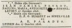 Humbert de Superville married Elisabeth Paradijs in 1816. They had two sons, one of whom died at a very young age; the other son died of typhoid at the age of 24.