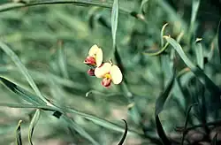 Daviesia implexa is a mound-shaped shrub that typically grows up to 1 m (3 ft 3 in) and 2 m (6 ft 7 in) wide and that has many tangled, glabrous branchlets with ridged or winged branchlets. Its phyllodes are scattered, linear but twisted, 5–100 mm (0.20–3.94 in) long and 2–5 mm (0.079–0.197 in) long. The flowers are arranged in groups of two or three in leaf axils, each flower on a pedicel 2.5–6 mm (0.098–0.236 in) long with bracts 1.5–2.0 mm (0.059–0.079 in) long at the base. The sepals are joined at the base, the upper two lobes joined for most of their length and the lower three pointed. The standard petal is elliptic, 10.0–11.5 mm (0.39–0.45 in) long and yellow or apricot-coloured with a reddish-brown ring around a yellowish-green base, the wings 8.5–11 mm (0.33–0.43 in) long, red and yellow, and the keel is about 6.5 mm (0.26 in) long and yellow. Flowering occurs from September to January and the fruit is a flattened triangular pod 15–17 mm (0.59–0.67 in) long.[2][3]