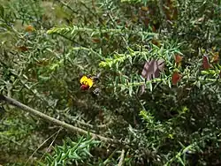 Daviesia pubigera is an open to spreading shrub that typically grows to a height of 0.7–2 m (2 ft 4 in – 6 ft 7 in) and has hairy branchlets and phyllodes. The phyllodes are sharply-pointed, narrowly egg-shaped, 5–14 mm (0.20–0.55 in) long and 1–4.5 mm (0.039–0.177 in) wide. The flowers are usually arranged singly, sometimes in pairs on a peduncle 2.5–5 mm (0.098–0.197 in) long, each flower on a pedicel 2–4 mm (0.079–0.157 in) long with bracts about 1 mm (0.039 in) long at the base. The sepals are 3.0–3.5 mm (0.12–0.14 in) long, the upper two lobes joined for most of their length and the lower three about 1 mm (0.039 in) long. The standard petal is elliptic with a notched centre, 5.5–7 mm (0.22–0.28 in) long, 4–7 mm (0.16–0.28 in) wide and yellow with thin red ring surrounding the yellow centre. The wings are 5.5–6.5 mm (0.22–0.26 in) long and red, the keel 4.5–5.0 mm (0.18–0.20 in) long and red. Flowering occurs from September to December and the fruit is a triangular pod 8–10 mm (0.31–0.39 in) long.[2][3]