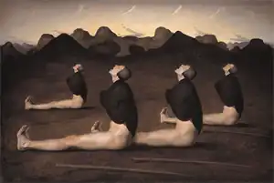 The painting depicts four identical men in a grey rocky landscape. The men are seen from the side as they sit on the ground, largely naked, with skull caps and leather wrapped around their shoulders; they face the sky above them with closed eyes and open mouths. Each of the men has a staff lying in the ground, near them.