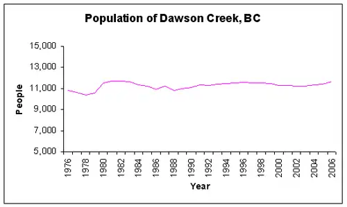 The population peaked in 1966 at 12,392, then declined throughout the 1970s, rising again briefly during the construction of the nearby town of Tumbler Ridge in the early 1980s. Dawson Creek's population has remained relatively stable since then. Between 2005 and 2009, the population rose from 10,869 to 11,514, per provincial estimates.[18]