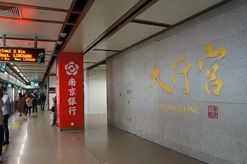 Daxinggong station (Chinese: 大行宫站; pinyin: Dàxínggōng Zhàn), is an interchange station of Line 2 and Line 3 of the Nanjing Metro. It started operations on 28 May 2010 along with the rest of Line 2.[1][2] The interchange with Line 3 opened along with the rest of that line on 1 April 2015.[3][4]