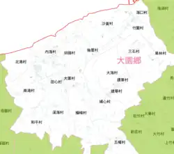 Dayuan District was originally named Toa-khu-hng (Chinese: 大坵園; Pe̍h-ōe-jī: Toā-khu-hn̂g), literally means a vast (大) vegetable garden (坵園) as an old Chinese name). In the earlier days, cottage scattered around the district with very limited settlers that grows vegetable and sweet potatoes. Hoklo people migrated to the area during the rule of Kangxi. In avoidance of the invasion of Yue people, walled villages were built around the settlements of Hoklo people.[2] It was renamed Ōsono Village (大園庄) during Japanese rule, and was part of Tōen District, Shinchiku Prefecture. After the handover of Taiwan from Japan to the Republic of China, it was called Dayuan Township.[3] It became Dayuan District in 2014, when Taoyuan County became a special municipality (and the former city of Taoyuan became a district of the special municipality).