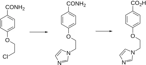 One convenient synthesis starts with the O-chloroethyl ether of p-hydroxybenzamide and proceeds bydisplacement with imidazole to give 2. Hydrolysis of the amide function completes the synthesis of dazoxiben.