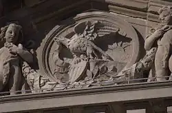 The building faces south, toward Illinois Route 64 and was designed by architect Herbert T. Hazelton, of the Chicago firm Watson & Hazelton.[7] The 128-foot (39 m) by 100-foot (30 m) building stands three stories; its exterior covered in Bedford, Indiana limestone. The courthouse's setting, on the public square in downtown Sycamore, renders it an impressive structure from most approach angles.[15] Heavily carved stone brackets support a lintel over the main doors on the building's front facades. The four columns dominating the front extends two stories and blend Ionic and Corinthian elements as they ascend from the second floor to the cornice level of the courthouse. Stone balustrades accent the small balcony on the second floor and the windows on the same floor, in the east and west wings, have a row of six balustrades below their sills, which form a continuous stringcourse around the building.[15]