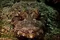 De Beaufort's flathead is a medium-sized fish which grows up to 50 cm (19.7 in), but the average size mostly observed is 35 cm (13.8 in).[2] The body is elongated and the head is particular because of its flat appearance like a duck bill. They have lappets at the rear of their globulous eyes, which help to break up the outline of the black iris and improve their camouflage. Juveniles begin black with few white spots and a white line behind the head. The adults have a body coloration which can vary in intensity according to the surrounding. The body is covered with a pattern like a mosaic of beige to brown spots or even greenish to grey separated by an interlacing of blue lines which ideally camouflages them with their habitat.[5]