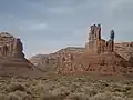 De Gaulle and His Troops is situated 16 miles (26 km) west of Bluff, Utah, in the Valley of the Gods, on land administered by the Bureau of Land Management.[4] Precipitation runoff from this iconic landform's slopes drains to the San Juan River via Lime Creek. Access to the butte is via the 17-mile Valley of the Gods Road. Topographic relief is significant as the summit rises 540 feet (165 meters) above the surrounding terrain in 0.15 mile (0.24 km). This landform's toponym has not been officially adopted by the United States Board on Geographic Names, however it does appear on USGS topographic maps.[1] Some rock climbers call this landform "North Tower."[1]