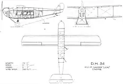 The DH.34 had a wooden, plywood-clad fuselage, with the cockpit (for two pilots) being positioned ahead of the wings and the passenger cabin. It had two-bay wooden wings and was powered by a Napier Lion engine, which was fitted for inertia starting, avoiding the necessity for hand swinging of the propeller to start the engine.[1] Unusually, the design of the aircraft allowed an entire spare engine to be carried on board across the rear of the passenger cabin. The cabin door's unusual shape was to allow the engine to be loaded and unloaded, and a specially-fitted 'porthole' on the other side of the cabin would be removed to allow the propeller boss to protrude out the side of the aircraft.[3] Spare engines were not carried routinely (the DH.34's payload was too low to carry both passengers and a spare engine) but this facility was used by operators to quickly fly spare engines out to aircraft that had suffered breakdown.