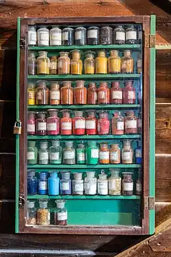 In 1960, the eight-sided paint mill 'De Duinjager' was removed from its former position due to urban development and placed on top of the old 'De Kat' storehouse.[7] The mill again grinds raw materials, including minerals and chalk, to make pigments for paints traditionally.[4] The mill is owned by the Vereniging De Zaansche Molen.[8]