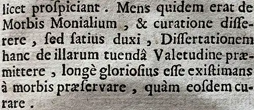 His main precept was given in 1711 in his Oratio xiii. De contagiosa epidemia. On that occasion, he pronounced the well-known precept “far better to prevent than to cure”. This expression evokes the phrase he used some years later in the dissertation on nuns’ health that appeared in the 1713 edition of the Diatriba. He explained, with other words, the idea already expressed earlier, preaching this new message fully and with courageous perseverance.