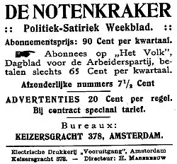 When Adolf Hitler became chancellor of Germany in 1933, German politics was dealt with on numerous covers and in numerous illustrations, and illustrated articles. Illustrators from this time included George Van Raemdonck, Tjerk Bottema, Jan Rot, Albert Hahn jr., Paul van Reen and Albert Funke Küpper. Funke Küpper became the driving force behind De Notenkraker starting in the 1920s. After his early death in 1934, the paper was discontinued; the last issue was in July 1936. After Funke Küpper's death other socialist publications became popular with more photographs such as Wij and the VARA Radio Guide.