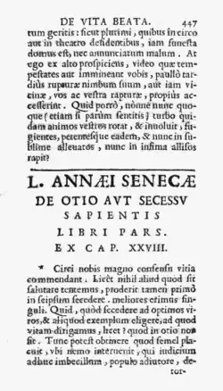 ![]() From the 1643 edition, published by Francesco Baba. Its position, appended to the end of De Vita Beata, reflects the manuscript tradition | |