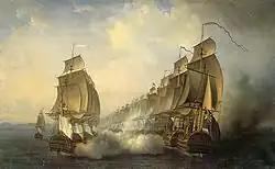 The first one, Louis Alexis de Perier de Salvert (1730-1803), count of Salvert, took part in the Duc d'Anville expedition (1746), the Battle of Minorca (1756), the Battle of Lagos (1759) and the Battle of 23 October 1762, the final maritime confrontation of the Seven Years' War. During the American Revolutionary War, Perier de Salvert was second in command of the Languedoc (1778), the flagship of d'Estaing's squadron. Under his command, he took part in all the battles against the English: the Battle of Rhode Island, the Battle of Saint Lucia, the Battle of Grenada and the Siege of Savannah.[25] As chef d'escadre and knight of Saint-Louis, Louis XVI appointed him a member of the Society of the Cincinnati, created by Washington to reward soldiers who had distinguished themselves during the conflict.[26] Louis Alexis's son François de Perier de Salvert (1764-1834), count of Salvert, was a ship's captain and harbourmaster at Pointe-à-Pitre in Guadeloupe. He was held as a prisoner on parole at Leek, Staffordshire, from 1803 to 1814.[27] François had a son, Charles de Perier de Salvert, a judge of peace who died in Basse-Terre in 1904.[28] The name de Perier de Salvert became extinct in 2018 in Guadaloupe with its descendant Mathilde de Perier de Salvert who had a son from his marriage in 1960.[29]