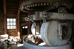 The first paper mill in the Zaan region was built in 1605.[3] De Schoolmeester was built in 1692.[1] It is also known by the nickname De Gauwdief.[4] The name De Schoolmeester (English: The Schoolmaster) probably denotes the occupation of one of the founders. The mill originally made grey paper. In 1778, the mill was powering two Hollander beaters. In 1852, the mill was bought by Gerbrand de Jong, who owned another wind-powered paper mill, De Kaarsenmaker at Zaandijk. He bought another nearby paper mill, De Vergulde Bijenkorf in 1854. In 1871, the mills were owned by Gebroeders de Jong, who demolished De Kaarsenmaker in the autumn of 1873. In 1877, the mill was modernised and a steam engine installed as auxiliary power. This meant that the mill was uninsurable against fire. In 1902, the nearby De Vergulde Bijenkorf burnt down. A steam driven paper factory was erected to replace it. This factory was able to make white paper. A fire started at De Schoolmeester in 1915 but was extinguished.[5] In 1948, the steam engine was replaced by a Ford gas engine. On 1 March 1949, the drying sheds were damaged in a storm, with over 30 metres (98 ft) of them being affected. They were rebuilt shorter than they had been previously.[4] On 28 August 1957, De Schoolmeester was sold to Vereniging van Nederlandsche Papierfabrikanten by the de Jongs.[5] In 1964, the gas engine was replaced by a Bernard diesel engine.[4] In 1977, the mill was bought by Vereniging Zaansche Molens.[3] The diesel engine was replaced by an electric motor in 1979.[4] A four-year restoration of the mill at a cost of €450,000 was completed in June 2002. The work included complete renewal of the drying sheds.[3]