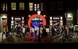 ![]() Crowds walking past window prostitution and other sex businesses along the Oudezijds Achterburgwal canal in De Wallen | |