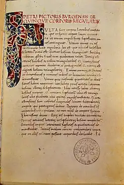 After its dedication, the title page of De quinque corporibus regularibus begins Petri pictoris Burgensis De quinque corporibus regularibus.[13] The first three words mean "Of Peter the painter, from Borgo", and refer to the book's author, Piero della Francesca (from Borgo Santo Sepolcro[7]); the title proper begins after that. A decorative initial begins the text of the book.