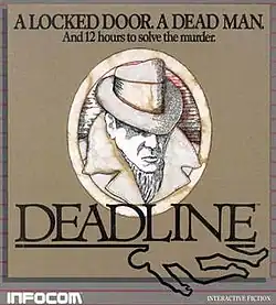 Deadline is an interactive fiction detective video game published by Infocom in 1982. Written by Marc Blank, it was Infocom's third game. It was released for the Amstrad CPC, Apple II, Atari 8-bit computers, Commodore 64, IBM PC (as a self-booting disk), Osborne 1, TRS-80, and later for the Amiga and Atari ST.