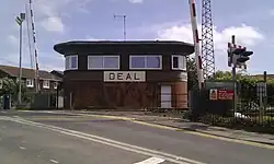 Deal used to have extensive coal yards (bordered by St Patrick's Road), goods yards (now Sainsbury's) and a locomotive shed and turntable (now Bridgeside). The locomotive shed was shut in 1930. Albert Terrace was built in the 1860s for railway employees in a line with Lower Queen Street before the railway was extended to Dover. Hence the London Road flyover was built with a 'kink' around them. The station-master's house received a direct hit during World War 2 (although a garden wall still exists), as did the goods shed.[3][4] The substantial buildings on the 'down' platform were demolished about 1970 and replaced with small CLASP-style buildings.[3] These have since been replaced with a small modern shelter, as shown in the photograph on the right.