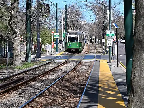 Dean Road station is a light rail stop on the MBTA Green Line C branch, located in the median of Beacon Street in Brookline, Massachusetts. The stop has two staggered side platforms, with the platform before the grade crossing in each direction. Dean Road has no MBTA bus connections and is not accessible.