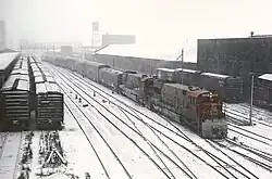 In the aftermath of the 1874 fire, much of the land that is now Dearborn Park was purchased by real estate promoter John B. Brown and his associates, who saw the potential of southside access to the city by rail and acquired the land, principally for the Chicago and Western Indiana Railroad (C&WI) but other rail lines also bought nearby land.[11] (Perhaps not surprising to those who live in Chicago, there were accusations of bribery[12] and self-dealing[13] regarding the acquisition of the land.) The investment in the rail lines culminated in the opening of Dearborn Station at the northern border of Dearborn Park in 1885,[14] resulting in decades of economic growth in the area that reversed course into steep decline in the 1950s and 1960s.[15] Dearborn Station ultimately closed in 1971.[14]