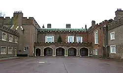 Mary's body was embalmed with spices and sealed in a lead coffin. It was later said that important state papers and accounts in Mary's chamber were destroyed when they were used in the making of her cerecloth, in "cering the corse".[22] The coffin lay in state on a trestle table covered with cloth of gold in the Privy Chamber of the palace, which was draped with black cloth decorated with escutcheons of her heraldry and the arms of Philip II of Spain conjoined, and her arms displayed in the Order of the Garter.[23] Some of her gentlewomen kept vigil, day and night, until 10 December, when the coffin was taken to the palace chapel. Margaret Douglas, Countess of Lennox was the Chief Mourner.[24]