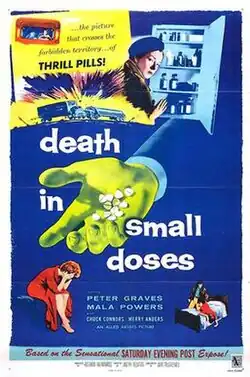 Death in Small Doses is a 1957 American film noir crime film directed by Joseph M. Newman and starring Peter Graves and Mala Powers.[1] A government agent investigates the use of illegal amphetamines among long-haul truck drivers.