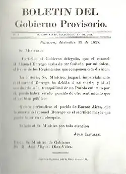 Dorrego was not sent to Buenos Aires for a trial. The unitarians Juan Cruz Varela and Salvador María del Carril wrote to Lavalle instructing him to execute Dorrego. Varela asked him to destroy the mails after reading them, but Lavalle kept them. Dorrego was executed in Navarro on December 13, 1828.[8][12]