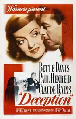 Deception is a 1946 American film noir drama released by Warner Brothers and directed by Irving Rapper. The film is based on the 1927 play Monsieur Lamberthier by Louis Verneuil. The screenplay was written by John Collier and Joseph Than. It stars Bette Davis, Paul Henreid, and Claude Rains, who had also appeared together in the highly successful Now, Voyager (1942),[3] which was also directed by Rapper.