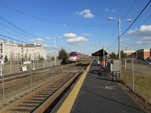 In the late 1980s, the Dedham Corporate Center office park was built nearby due to convenient access to Route 128 and Route 1.[9] The developer, National Development, constructed the station platforms and a temporary 500-space parking lot at a cost of $527,000.[10] The size and temporary nature of the parking lot was intended to avoid lengthy environmental review.[10] National Development had previously donated land for Forge Park/495 station, which had opened in 1988.[11] The development and station were opposed by some residents and local politicians concerned about additional traffic at the East Street rotary.[10][9]