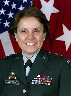 Dee Ann McWilliams is a retired United States Army major general. McWilliams is past President of the Women in Service for America Memorial Foundation.[1] She took her commission in 1974 in the Women's Army Corps and was assigned to the Adjutant General Corps. In over 29 years with the army, she held a variety of Human Relations positions, commanding four companies, a training battalion, and a personnel brigade. She also taught national strategic studies and leadership, and served as an Equal Opportunity Officer.