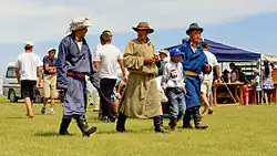 The deel is still commonly worn by both men and women outside major towns, especially by herders.[1] In urban areas, the deel is mostly only worn by elderly people, or on festive occasions. The deel appears similar to a caftan or an old European folded tunic.[1] Deels typically reach to below the wearer's knees and fan out at the bottom. They come in a variety of colors but are most commonly blue, olive, or burgundy.