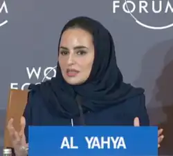 AlYahya is an Edison Alliance Champion for Digital Inclusion, and also a Commissioner with the Broadband Commission for Sustainable Development.[8] She is part of multiple boards in the Kingdom of Saudi Arabia, including the Saudi National Bank (SNB),[18] Saudi Authority for Intellectual Property (SAIP),[19] Saudi Company for Artificial Intelligence (SCAI), and Saudi Federation for Cybersecurity, Programming and Drones (SAFSCP).[20]