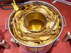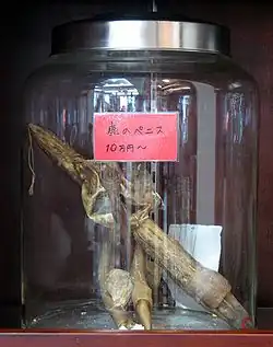 Like turtle's blood and penis, deer penis is one of the "delicacies" served in large jars in Snake Alley, Taipei.[6] It is also served on the Chinese mainland in restaurants such as the Guo Li Zhuang.[7] Deer penis wine can be sold at $12 a glass and often as high as $455 for a two-litre bottle.[8] Deer-antler wine, known as Lurongjiu, is also said to enhance sexual potency in men and to have a warming effect, aiding the joints.[9][10] A deer's penis, turtle's penis, or bull's penis is consumed in restaurants and is known in Singapore to be offered as a soup delicacy.[8]