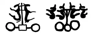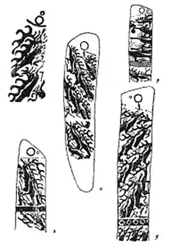 Various tools typical of chariot riding also appear in the drawing of the deer stones, such as rein holders.[54] Rein holders were designed to hold the reins in place to free the rider's hands, and were probably hung to the rider's waist.[55][56] They worked as rein hooks, attached at the belt, for "hands free" horse control while using weapons.[57][58]