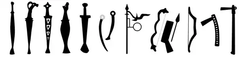 The leaders depicted in these deer Stones (dated to 1400-700 BCE) were equipped with weapons and instruments of war, such as swords, daggers, knives, shafted axes, quivers, fire starters, or curved rein holders for their chariots.[45] Weapons and tools can be seen throughout all the stones, though weapons make a stronger appearance in the Sayan-Altai stones.[2] Bows and daggers appear frequently, as well as typical Bronze-Age implements, such as fire-starters or chariot rein holders.[18] The appearance of these tools helps date the stones to the Bronze Age.