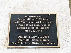On May 26, 1944, a US Navy plane crashed in Deerfield on the current site of the Deerfield Public Library, killing Ensign Milton C. Pickens.[7] Following World War II, a portion of Waukegan Road (Route 43) that runs through Deerfield was designated a Blue Star Memorial Highway.[8]