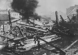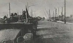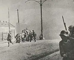 After breaching the first barricade, the main part of the German column continued its assault along Grójecka Street. Some vehicles, unable to fit on the inadequately wide street, entered side streets and alleys, including Białobrzeska and Wolnej Wszechnicy streets.[74] Alongside the regular soldiers, residents of Ochota joined the fight. From the windows of buildings, German tanks were pelted with petrol bombs and grenades, and stones were thrown at them, along with boiling water.[75][76] To the east of Zieleniak, the Germans managed to seize the buildings on Opaczewska Street, including the Free Polish University building, but their assault ultimately stalled before Winnicka Street.[77]