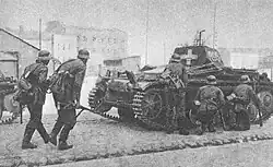 Fearing that the tanks would become embroiled in night fighting in the city, General Reinhardt, in agreement with General Hoepner, ordered a halt to the assault.[62] According to General Czuma's report, Polish losses amounted to 5 killed and two wounded (all from the 41st Infantry Regiment).[h] The Germans reportedly lost 4 tanks, of which all but one were managed to be towed from the battlefield.[63]