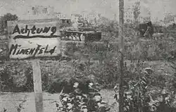 As early as September 5, barricades and anti-tank barriers began to be constructed in Ochota,[35] particularly blocking key routes leading into the city. The civilian population actively participated in their construction.[36] Minefields were laid in the outskirts.[37] Obstacles, fortifications, and mines were also set up in Wola.[38]