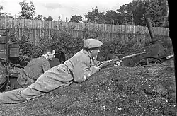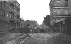 The few and poorly armed units of the Wola Subdistrict were almost immediately pushed onto the defensive.[11] From August 2 to 4, elements of the Hermann Göring Division tried to force their way through the Wola artery. The enemy attacks primarily targeted the insurgent barricades in the area of Wolska and Górczewska streets, manned by soldiers of the Wola Subdistrict and supporting units of the People's Army.[12] Initially, the Radosław Group remained somewhat on the periphery of these struggles, with its actions not extending westward beyond the line of the Wola cemeteries.[11] On August 2, small groups of German armored units repeatedly penetrated Okopowa Street from the north, attempting to break through to the city center. During these skirmishes, soldiers from the Zośka Battalion captured 2 German Panther tanks.[c] This success, combined with the earlier capture of a German truck with tank ammunition by soldiers from the Pięść Battalion,[13] enabled the formation of an insurgent armored platoon under the command of Lieutenant Wacław Micuta, codenamed Wacek.[14] Meanwhile, the Zośka Battalion soldiers also managed to capture the school on Spokojna Street, where they defeated a unit of Russian-speaking collaborators (the school henceforth became the main stronghold of the Polish defense on the northern flank of the Radosław Group). Around 2:00 PM, however, the Germans launched a strong attack along Okopowa Street, driving 50 Polish hostages tied to a ladder in front of their tanks. Kedyw soldiers managed to hold the barricade on Okopowa Street and the positions at Pfeiffer's tannery and the St. Kinga school, but the German tanks succeeded in breaking through to Śródmieście.[15][16][17]
