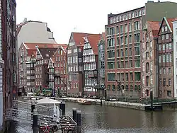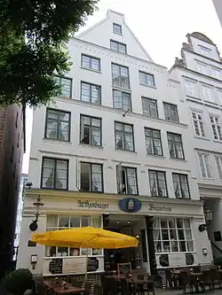 Deichstraße dates back to the 14th century; it was first mentioned in 1304.[1] Located adjacent to Nikolaifleet and close to the Speicherstadt,[2] it now contains carefully restored 17th–19th-century houses, all that is left of the old harbour district.[3][4] The Great Fire of 1842 broke out in Deichstraße 42[3][4] and destroyed many of the original buildings, but spared the southern end of the street spreading - driven by the wind - mostly northeastwards. Today, Deichstraße –along with Neustadt's Peterstraße– contains some of the oldest buildings in the city, including the oldest warehouse, at Peterstraße 27, built in 1780.[3]